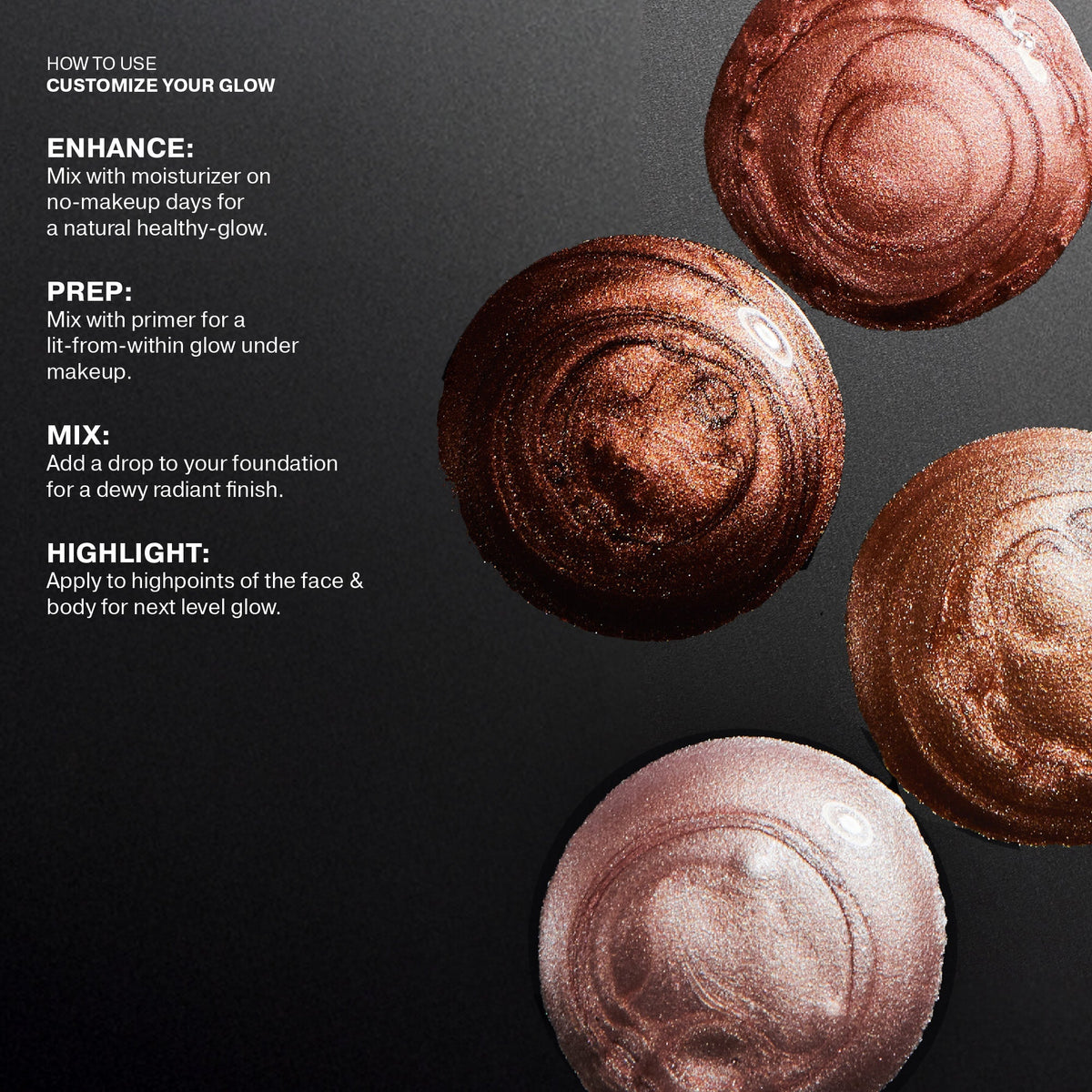 - This concentrated liquid shimmer can be added to your foundation, primer, or moisturizer, or simply used on its own for a super highlighted glow.